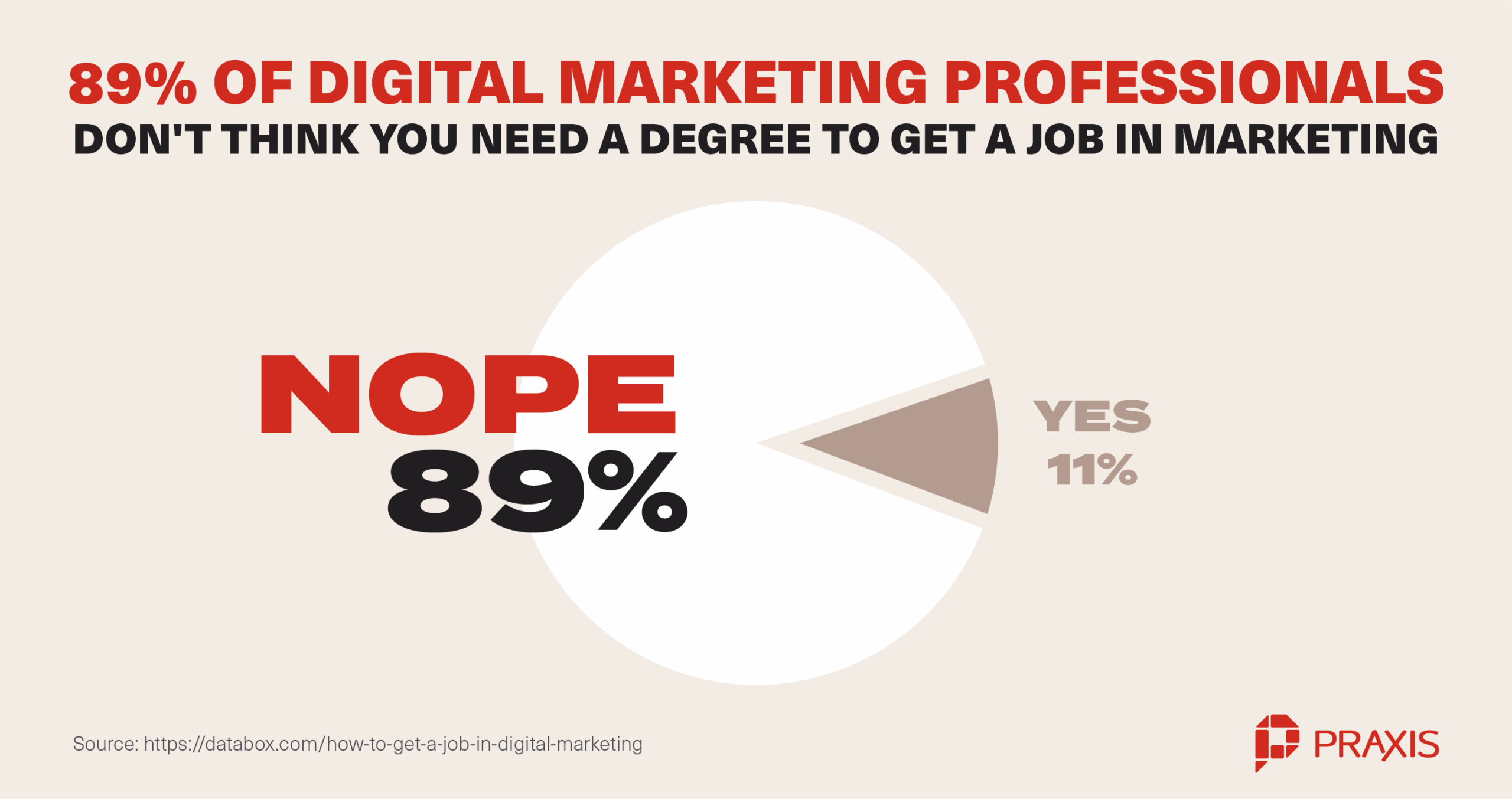 Lauren: “I’m interested in digital marketing, which is a growing field in which 89% of current professionals say you don’t need a college degree. I discovered a bootcamp called Praxis that will teach me the skills I need and help me land a job by networking with successful digital marketers. My goal is to use the skills and real-world experience I gain to start my own marketing agency in four years, right when I’d just be graduating college and looking for my first job.”